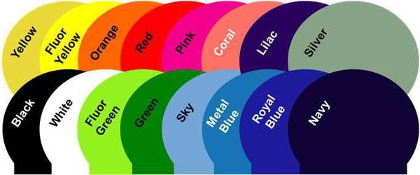 Available in adult and junior sizes and 20 colours (please clik on the colour catalogue image for details): black, white royal blue, navy blue, sky blue, green, fluor green, yellow, fluor yellow, orange, pink, metal blue, coral, red, silver, and 4 multi colour models.